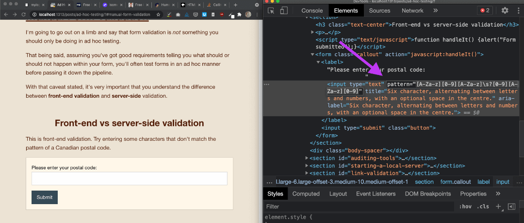 This is front-end validation. Try entering some characters that don't match the pattern of a Canadian postal code.
